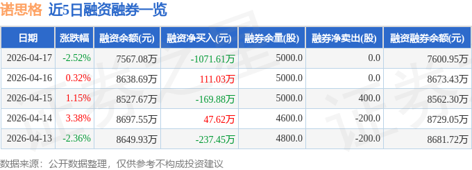 诺思格融资融券信息显示,融资方面,当日融资买入619.74万元,融资偿还1691.35万元,融资净偿还1071.61万元。融券方面,融券卖出0.0股,融券偿还0.0股,融券余量5000.0股,融券余额33.87万元。融资融券余额7600.95万元。