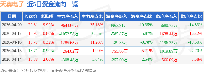 4月20日的资金流向数据方面,主力资金净流入9643.66万元,占总成交额25.18%,游资资金净流出3962.91万元,占总成交额10.35%,散户资金净流出5680.75万元,占总成交额14.83%。