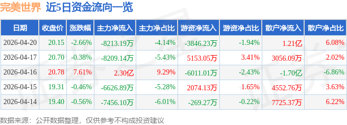 证券之星消息,截至2026年4月20日收盘,完美世界(002624)报收于20.15元,下跌2.66%,换手率5.28%,成交量96.51万手,成交额19.85亿元。