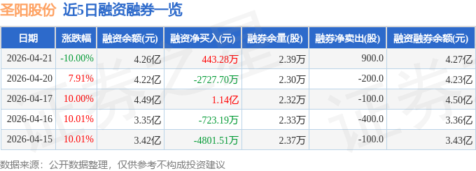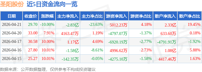 证券之星消息,截至2026年4月21日收盘,圣阳股份(002580)报收于29.7元,下跌10.0%,跌停,换手率8.84%,成交量40.0万手,成交额11.98亿元。