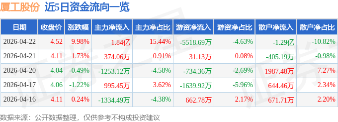 证券之星消息,厦工股份4月22日涨停收盘,收盘价4.52元。该股于9点33分涨停,30次打开涨停,截止收盘封单资金为1186.21万元,占其流通市值0.15%。