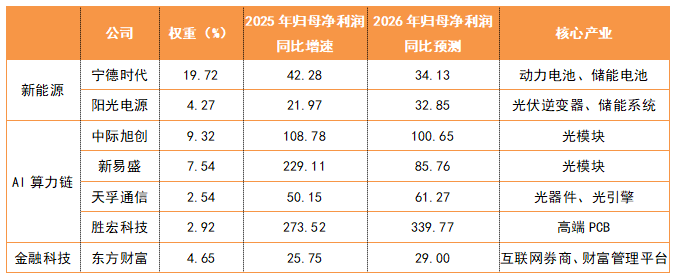 表:“创业板七姐妹”主要分布在新能源和AI算力链,2025-2026年大多业绩高增