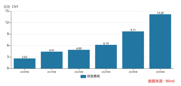 从财务数据可以清晰地看到石头科技在研发上的战略决心:2025年石头科技研发投入14.20亿元,同比增长46.13%,在行业内处于领先水平;拉长时间看,从2020年到2025年,石头科技的研发投入已经从2.63亿元增长到14.20亿元,这充分表明石头科技对技术研发的重视。