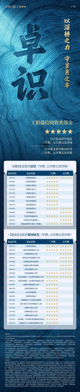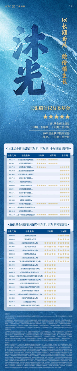 4、基金产品评级来自晨星,数据截至2026年3月31日,工银新材料新能源股票、工银智能制造股票A、工银物流产业股票A、工银研究精选股票、工银新兴制造混合A、工银银和利混合、工银新得利混合、工银新生利混合、工银瑞信聚丰混合A、工银聚享混合A、工银聚安混合A、工银可转债债券、工银添慧债券A、工银添福债券A、工银信用纯债债券A、工银瑞信彭博国开行债券1-3年指数A、工银瑞信丰收回报灵活配置混合A获评三年期五星评级。工银新材料新能源股票、工银智能制造股票A、工银研究精选股票、工银新兴制造混合A、工银银和利混合、工银添福债券A、工银纯债债券A、工银信用纯债债券A、工银尊益中短债债券A、工银瑞信彭博国开行债券1-3年指数A、工银瑞信丰收回报灵活配置混合A获评五年期五星评级。工银物流产业股票A、工银美丽城镇主题股票A、工银国企改革主题股票、工银文体产业股票A、工银新蓝筹股票A、工银研究精选股票、工银战略转型股票A、工银养老产业股票A、工银前沿医疗股票A、工银新金融股票A、工银新趋势灵活配置混合A、工银消费服务混合A、工银瑞信丰收回报灵活配置混合A获评十年期五星评级。