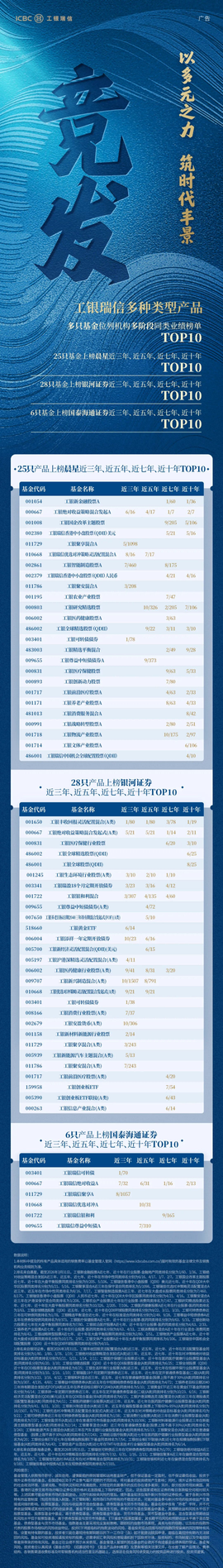 从大盘价值到成长风格,从高端制造到医药消费,工银瑞信以全行业、全市场的深度覆盖与均衡布局,展现出平台型资管机构的系统性优势——不依赖单一赛道博弈,而是通过扎实的宏观研判、产业认知与个股挖掘,在不同市场周期中持续创造超额收益,为投资者提供穿越周期的权益配置工具。