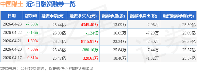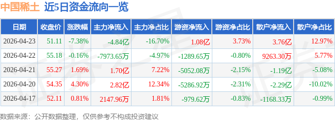 证券之星消息,截至2026年4月23日收盘,中国稀土(000831)报收于51.11元,下跌7.38%,换手率5.24%,成交量55.63万手,成交额28.96亿元。