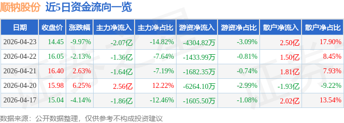 证券之星消息,截至2026年4月23日收盘,顺钠股份(000533)报收于14.45元,下跌9.97%,跌停,换手率13.88%,成交量95.04万手,成交额13.95亿元。
