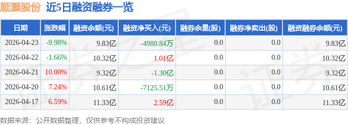 顺灏股份融资融券信息显示,融资方面,当日融资买入3.74亿元,融资偿还4.23亿元,融资净偿还4980.84万元。融券方面,融券卖出0.0股,融券偿还0.0股,融券余量0.0股,融券余额0.0万元。融资融券余额9.83亿元。