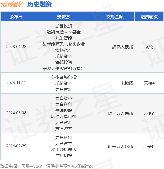 证券之星消息,根据天眼查APP于4月23日公布的信息整理,浙江无问智行科技有限公司A轮融资,融资额超亿人民币,参与投资的机构包括浙创投资,澄凯灵澄未来基金,九识智能,某新能源风电龙头企业,埃科汽车,架桥资本,海邦投资,宁波天使投资引导基金。