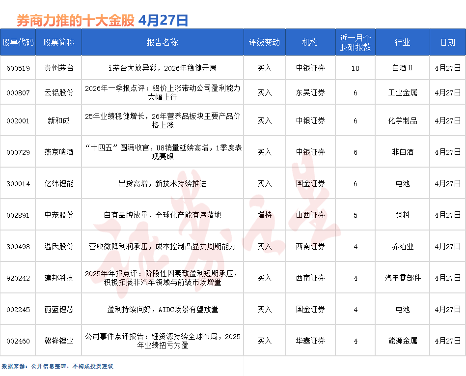 贵州茅台最受券商关注,近一个月获信达证券、东吴证券、国金证券、西南证券、中银证券、开源证券、国信证券等18份券商研报关注,仅4月27日就有中银证券、国信证券等2份券商研报,位居4月27日券商力推股榜首。