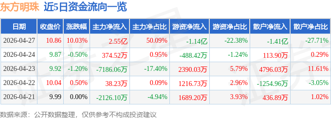 4月27日的资金流向数据方面,主力资金净流入2.55亿元,占总成交额50.09%,游资资金净流出1.14亿元,占总成交额22.38%,散户资金净流出1.41亿元,占总成交额27.71%。