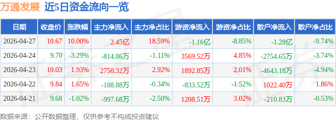 证券之星消息,万通发展4月27日涨停收盘,收盘价10.67元。该股于10点38分涨停,未打开涨停,截止收盘封单资金为8856.63万元,占其流通市值0.44%。