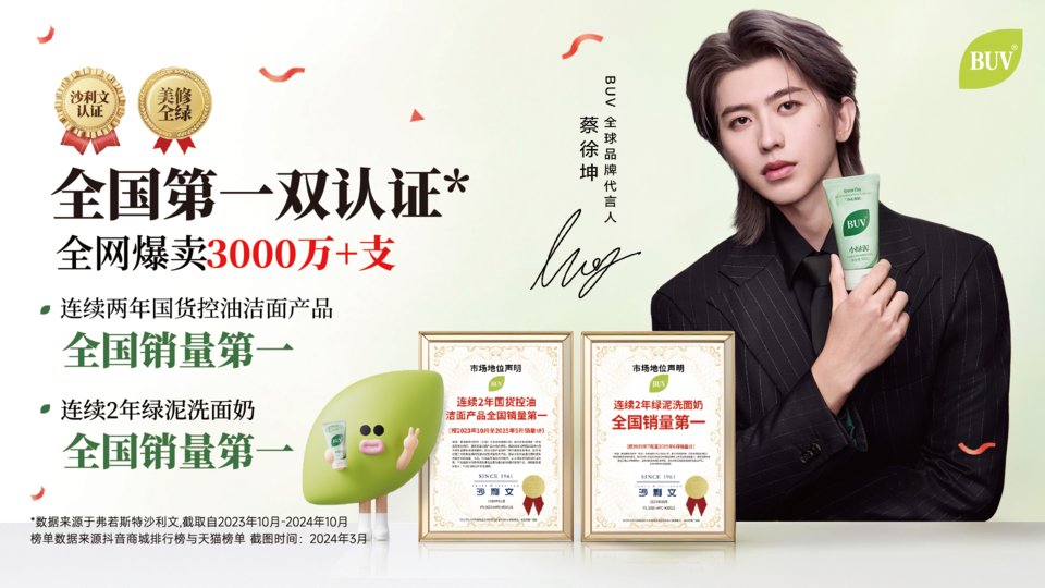 此次官宣蔡徐坤为全球品牌代言人,BUV同样采用了“专业对话专业”的策略。作为以原创音乐和专业舞台立身的偶像,蔡徐坤对“真控油、真洁净”的执着,与BUV“实力派控油”的品牌理念一脉相承。他在官宣中直言,小绿泥是他日常控油的首选,无论是妆前快速净透还是睡前舒缓调理,都能让洁面变成一种“超植”的享受。