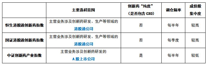 接下来,我们就对比创新药板块三条主要指数的差异:恒生港股通创新药指数、国证港股通创新药指数与中证创新药产业指数。