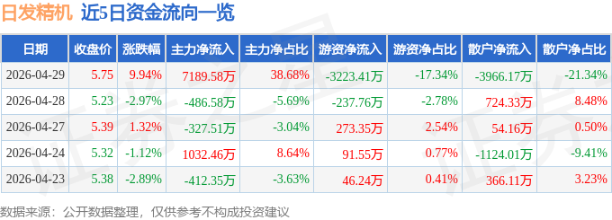 证券之星消息,日发精机4月29日涨停收盘,收盘价5.75元。该股于9点34分涨停,未打开涨停,截止收盘封单资金为1.05亿元,占其流通市值2.54%。