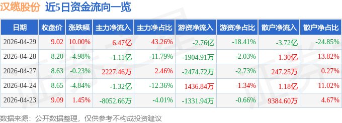 证券之星消息,汉缆股份4月29日涨停收盘,收盘价9.02元。该股于10点19分涨停,未打开涨停,截止收盘封单资金为1.36亿元,占其流通市值0.45%。