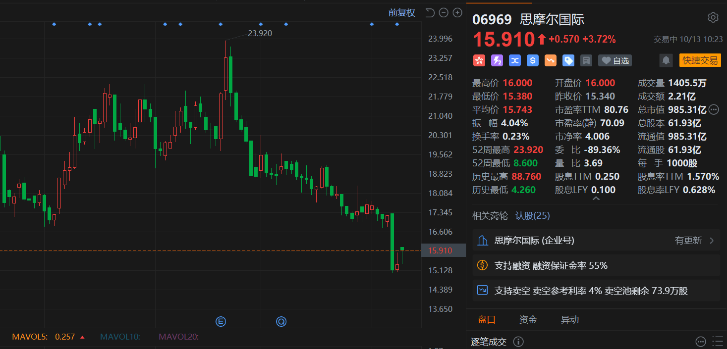 思摩尔国际(6969.HK)盘中一度涨超4%,股价一度重回16港元关口,总市值985亿港元。
