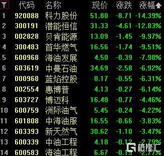 油气开采及服务板块转跌,科力股份跌超14%,潜能恒信跌超12%,贝肯能源跌停,首华燃气跌超9%。