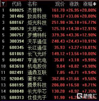 光纤概念股走高,杰普特、致尚科技20cm涨停,炬光科技涨超16%,太辰光、罗博特科涨涨超12%。