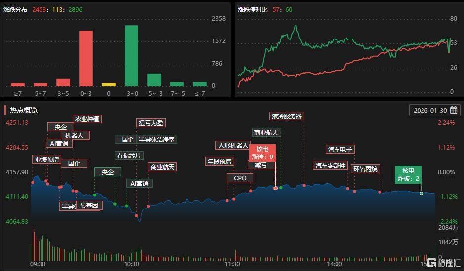 1月30日,A股三大指数涨跌不一,截至收盘,沪指跌0.96%报4117点,深证成指跌0.66%,创业板指涨1.27%。全市场成交额2.86万亿元,较前一交易日缩量3970亿元,近2900股下跌。