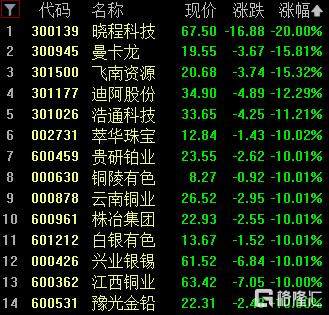 黄金概念股暴跌,晓程科技20cm跌停,飞南资源、曼卡龙跌超15%,迪阿股份跌超12%。