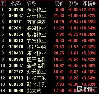 种植业与林业板块大涨,神农种业涨超12%,秋乐种业涨超10%,万向德农、登海种业、敦煌种业涨停。