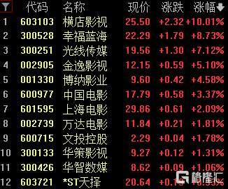 影视院线板块上涨,横店影视涨停,幸福蓝海涨超8%,光线传媒涨超7%,金逸影视涨超5%。