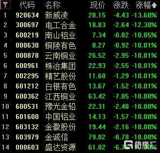 工业金属板块走低,新威凌跌超13%,电工合金跌超12%,南山铝业、铜陵有色、云南铜业等跌停。