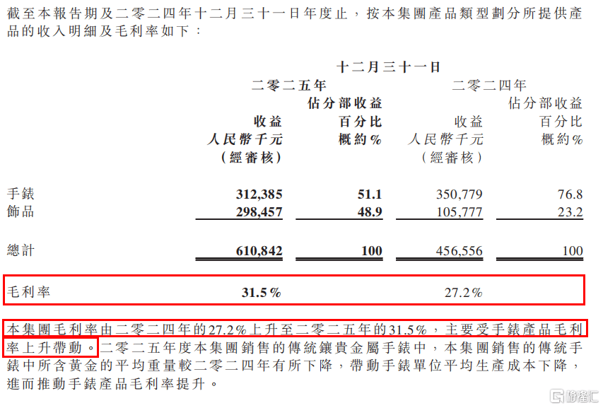 年报在解释毛利率提升时提到一个细节:2025年销售的传统足金手表中,所含黄金的平均重量比2024年有所下降。换句话说,同样一只手表,用的金子少了,但售价并没有跟着下调。这意味着产品的附加值在提升,原材料成本占比下降,毛利空间被拉大。