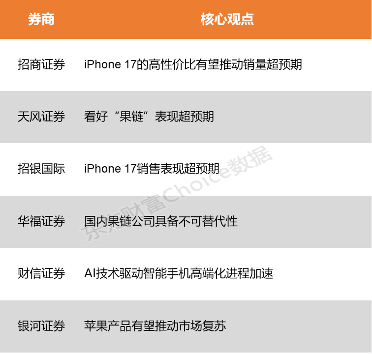 招商证券表示,苹果3年硬件创新加速周期开始,且其在端侧AI软件和生态的创新在明年值得重视,建议把握低估的果链。天风证券指出,iPhone17系列领衔多款新品亮相,芯片、散热、传感器全面升级,看好“果链”表现超预期。