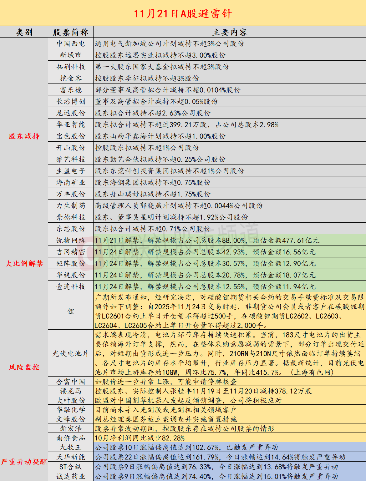 导读:财联社11月21日投资避雷针,近日,A股及海外市场潜在风险事件如下。国内经济信息方面包括:1)近期大幅上涨,广期所调整碳酸锂期货相关合约交易手续费标准及交易限额;2)需求端表现冷清,电池片环节库存持续快速积累;公司方面重点关注包括:1)15天13板合富中国表示,如股价进一步异常上涨,可能申请停牌核查;2)福龙马控股股东、实际控制人张桂丰11月19日至11月20日减持378.12万股;海外市场重点关注包括:1)纳指收跌超2%,英伟达跌3.1%;2)美国9月非农就业人数增加11.9万人,高于市场预期。