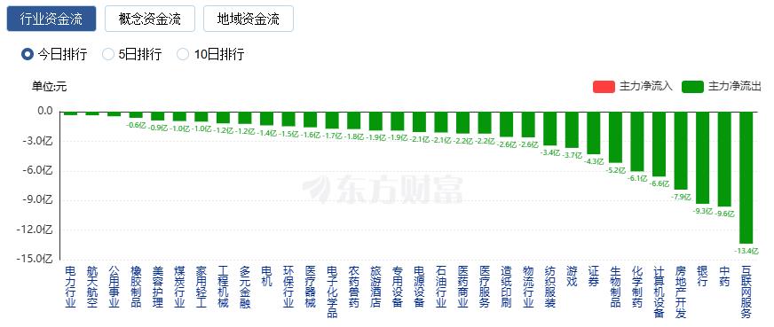 净流出方面,互联网服务、中药、银行等净流出排名靠前,其中互联网服务净流出13.38亿元。