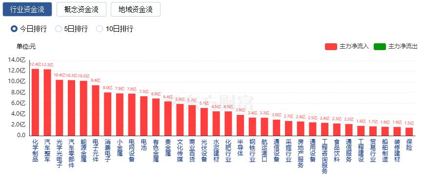 行业资金方面,截至收盘,化学制品、汽车整车、光学光电子等净流入排名靠前,其中化学制品净流入12.41亿。