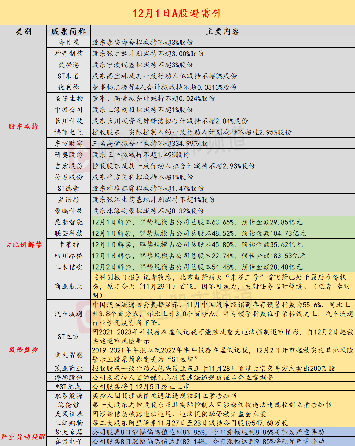 导读:财联社12月1日投资避雷针,近日,A股及海外市场潜在风险事件如下。国内经济信息方面包括:1)国家统计局发布数据显示,11月份制造业PMI为49.2%;2)蓝箭航天朱雀三号暂缓首飞;公司方面重点关注包括:1)ST立方因2021-2023年年报存在虚假记载可能触及重大违法强制退市情形,自12月2日起被实施退市风险警示;2)远大智能2019-2021年年报以及2022年半年报存在虚假记载,12月2日开市起被实施其他风险警示且股票简称变更为“ST远智”;海外市场重点关注包括:1)特朗普与马杜罗通话,直接要求对方下台;2)两艘油轮在黑海发生爆炸,暂无人员伤亡。