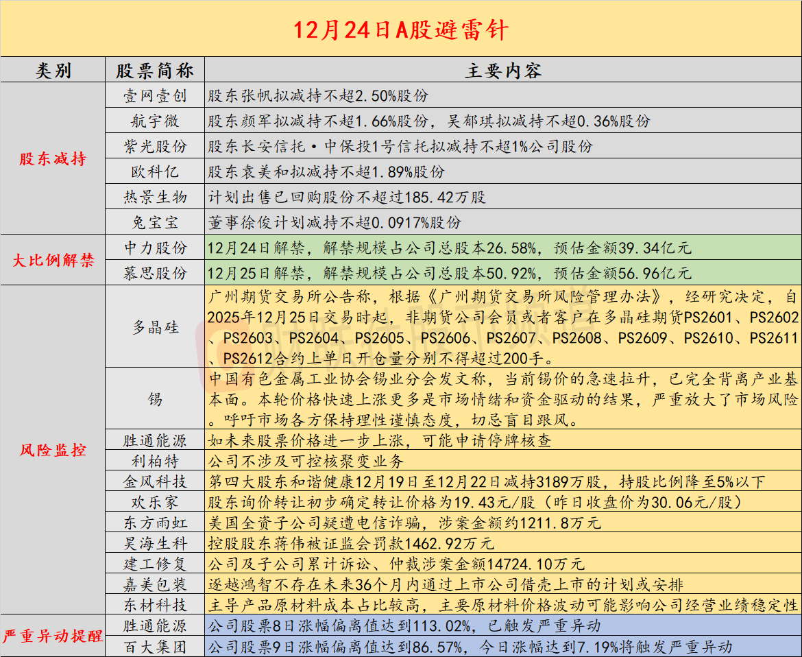 导读:财联社12月24日投资避雷针,近日,A股及海外市场潜在风险事件如下。国内经济信息方面包括:1)广期所调整铂等品种相关期货合约交易手续费标准、涨跌停板幅度和交易保证金标准;2)锡业分会发文,锡价急速拉升已完全背离基本面;公司方面重点关注包括:1)8连板胜通能源表示,如未来股票价格进一步上涨,可能申请停牌核查;2)2连板利柏特公告,公司不涉及可控核聚变业务;海外市场重点关注包括:1)美国第三季度GDP远超预期,通胀隐忧仍存;2)日本核反应堆20毫升含放射性水泄漏。
