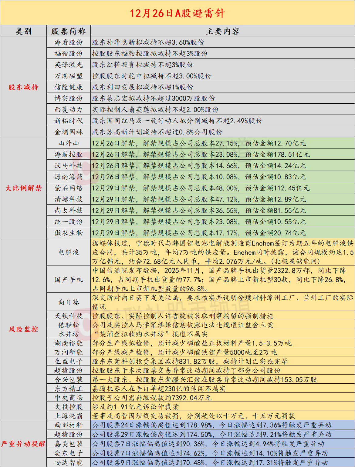 导读:财联社12月26日投资避雷针,近日,A股及海外市场潜在风险事件如下。国内经济信息方面包括:1)宁德时代与韩国电解液制造商Enchem签订5年35万吨大单,电解液均价仅2.076万元/吨;2)11月国产品牌手机出货量2322.8万部,同比下降12.6%;公司方面重点关注包括:1)深交所对向日葵下发关注函,要求核实并说明兮璞材料漳州工厂、兰州工厂的实际情况;2)天铁科技控股股东、实际控制人许吉锭被采取刑事拘留的强制措施;海外市场重点关注包括:1)电动车转型前景承压,英国充电桩建设明显降温;2)摩根士丹利预警2026年三大“变局”。