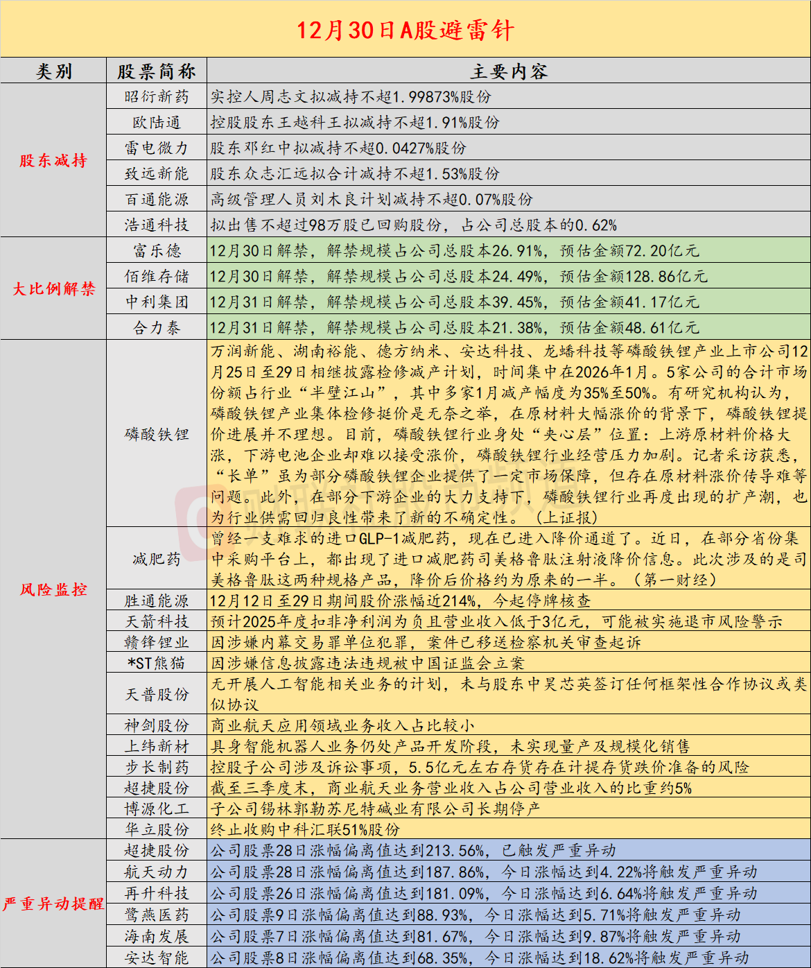 导读:财联社12月30日投资避雷针,近日,A股及海外市场潜在风险事件如下。国内经济信息方面包括:1)磷酸铁锂产业集体检修,研究机构称行业提价进展并不理想;2)进口减肥药司美格鲁肽注射液大幅降价;公司方面重点关注包括:1)12连板胜通能源公告,12月12日至29日期间股价涨幅近214%,今起停牌核查;2)天箭科技预计2025年度扣非净利润为负且营业收入低于3亿元,可能被实施退市风险警示;海外市场重点关注包括:1)国际贵金属大幅收跌,现货白银大跌近9%;2)美股三大指数均小幅收跌,大型科技股多数下跌。