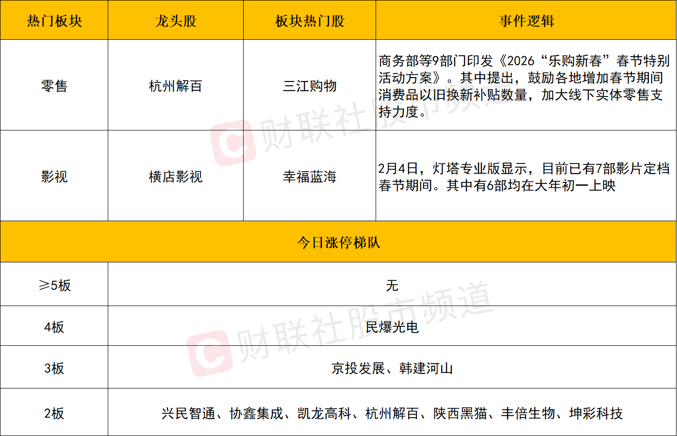 大消费板块全线爆发,食品饮料、零售、影视等细分方向均表现亮眼,海欣食品、安记食品、皇庭国际、三江购物、杭州解百、横店影视等个股涨停。