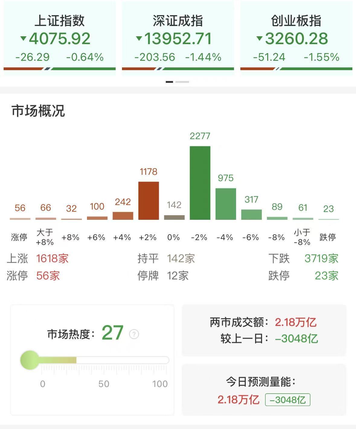 财联社2月5日讯,三大指数午后跌幅收窄,此前一度跌超1%,北证50指数跌超2%。沪深两市成交额2.18万亿,较上一个交易日缩量3048亿。盘面上,全市场超3700只个股下跌。从板块来看,大消费板块大涨,食品饮料、零售、影视院线、旅游酒店方向轮番活跃,横店影视6天5板,杭州解百2连板,安记食品、海欣食品、金逸影视、三峡旅游涨停。大金融板块午后走强,华林证券、厦门银行涨停。商业航天概念局部活跃,神剑股份3天2板。算力租赁概念回暖,群兴玩具4天2板,二六三封涨停。下跌方面,有色金属、电网设备、油气等板块跌幅居前。其中贵金属概念集体大跌,湖南白银跌停。截至收盘,沪指跌0.64%,深成指跌1.44%,创业板指跌1.55%。