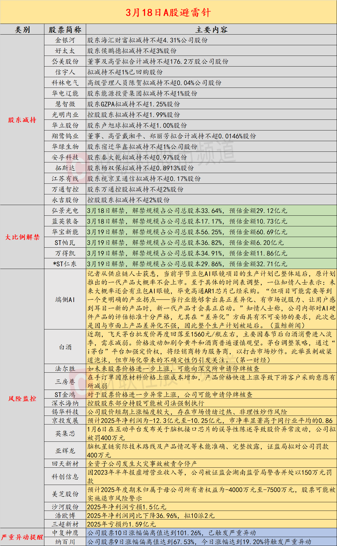 导读:财联社3月18日投资避雷针,近日A股及海外市场潜在风险事件如下。国内经济信息方面包括:1)字节原计划推出的一代豆包AI眼镜或不会上市;2)飞天茅台批发价再度回落至1560元/瓶左右;公司方面重点关注包括:1)4连板法尔胜表示,如未来股票价格进一步上涨,可能向深交所申请停牌核查;2)4连板三房巷公告,在手订单因原材料价格上涨成本增加,产品价格快速上涨导致下游客户采购意愿有所减弱;海外市场重点关注包括:1)伊朗最高领袖驳回与美国议和提案,坚持击败美以并索赔;2)波斯湾油气生产端首次遇袭,阿联酋大型天然气田遭无人机袭击后暂停作业。