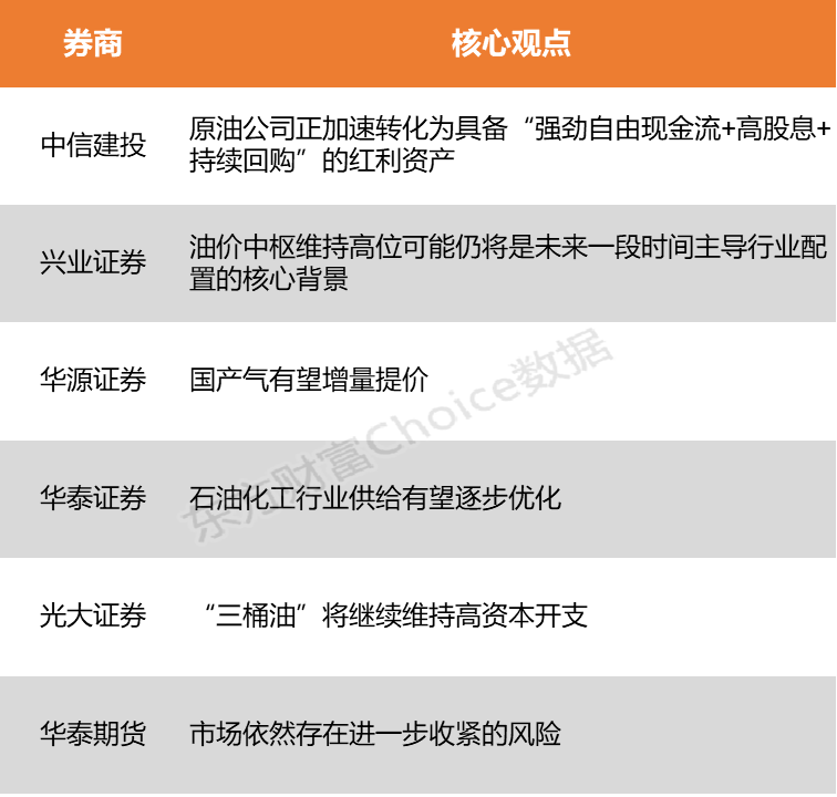 中信建投表示,原油板块的投资逻辑在资本开支克制、油价中枢维持高位的共振下在持续演化,原油公司正加速转化为具备“强劲自由现金流+高股息+持续回购”的红利资产。兴业证券指出,油价中枢维持高位,可能仍将是未来一段时间主导行业配置的核心背景。自身价格或利润有望与油价上行形成联动的行业,将是未来一段时间“涨价链”的一条重要线索。