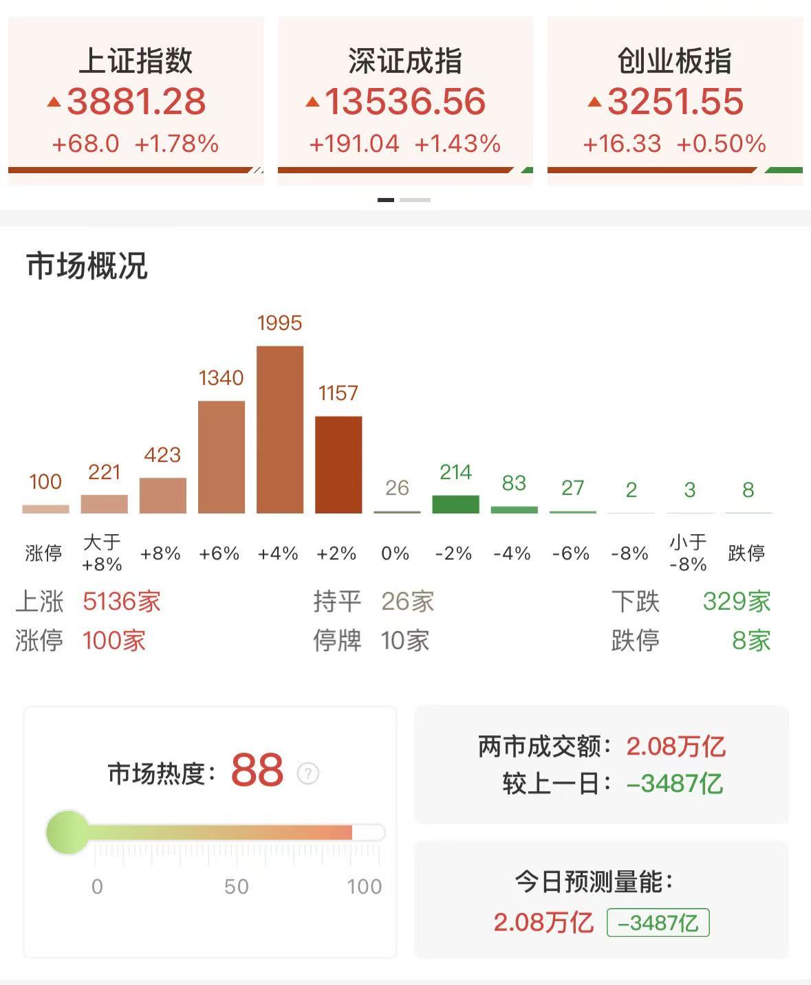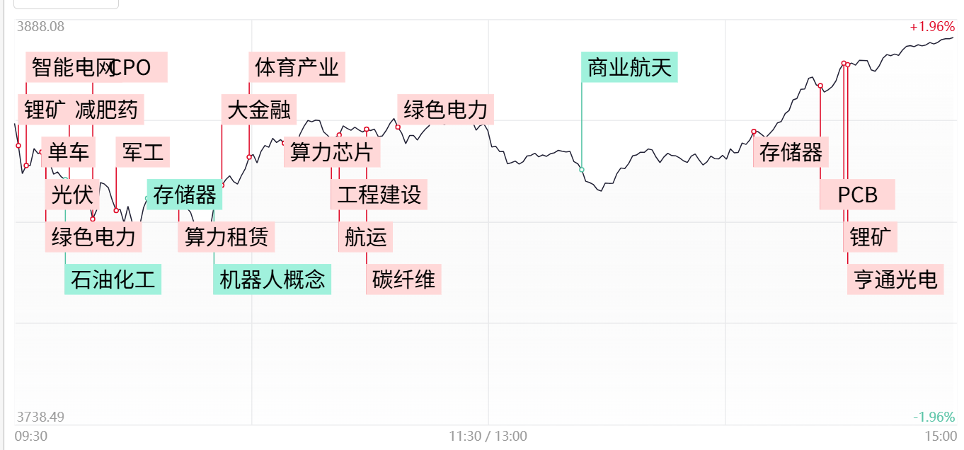 今日市场在昨日大跌超3%后实现探底回升,最终收盘站上3880点,部分修复昨日跌幅,全市场超5100只个股收红,百股涨停,短期修复反弹逻辑得到验证。从指数维度来看,沪指能否重新站上5日线,并回补昨日所留的跳空缺口,或可视为本轮反弹强弱的重要参照。量能方面来看,今日虽个股普涨,但两市成交额较昨日萎缩近3500亿,缩量反弹意味着多方力量尚不充裕,后续反弹若想持续仍待量能配合放大。另一方面,创业板指全天剧烈震荡,早盘一度跌近2.5%最终小幅收红,光伏、储能等新能源赛道权重遭遇补跌,不过午后随着算力硬件走强,成功带动创业板指止跌反弹,预计这两大核心热门赛道之间资金博弈仍将于后市持续上演。整体而言,大盘在地缘扰动减弱后呈现阶段性修复特征,但量能不足制约上行空间,操作上宜轻指数重个股,把握热点快速轮动节奏或是关键。