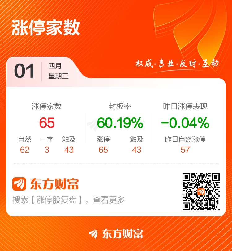 涨停个股数量方面,今日共计65股涨停,另有43只个股盘中一度触及涨停,封板率60.19%。