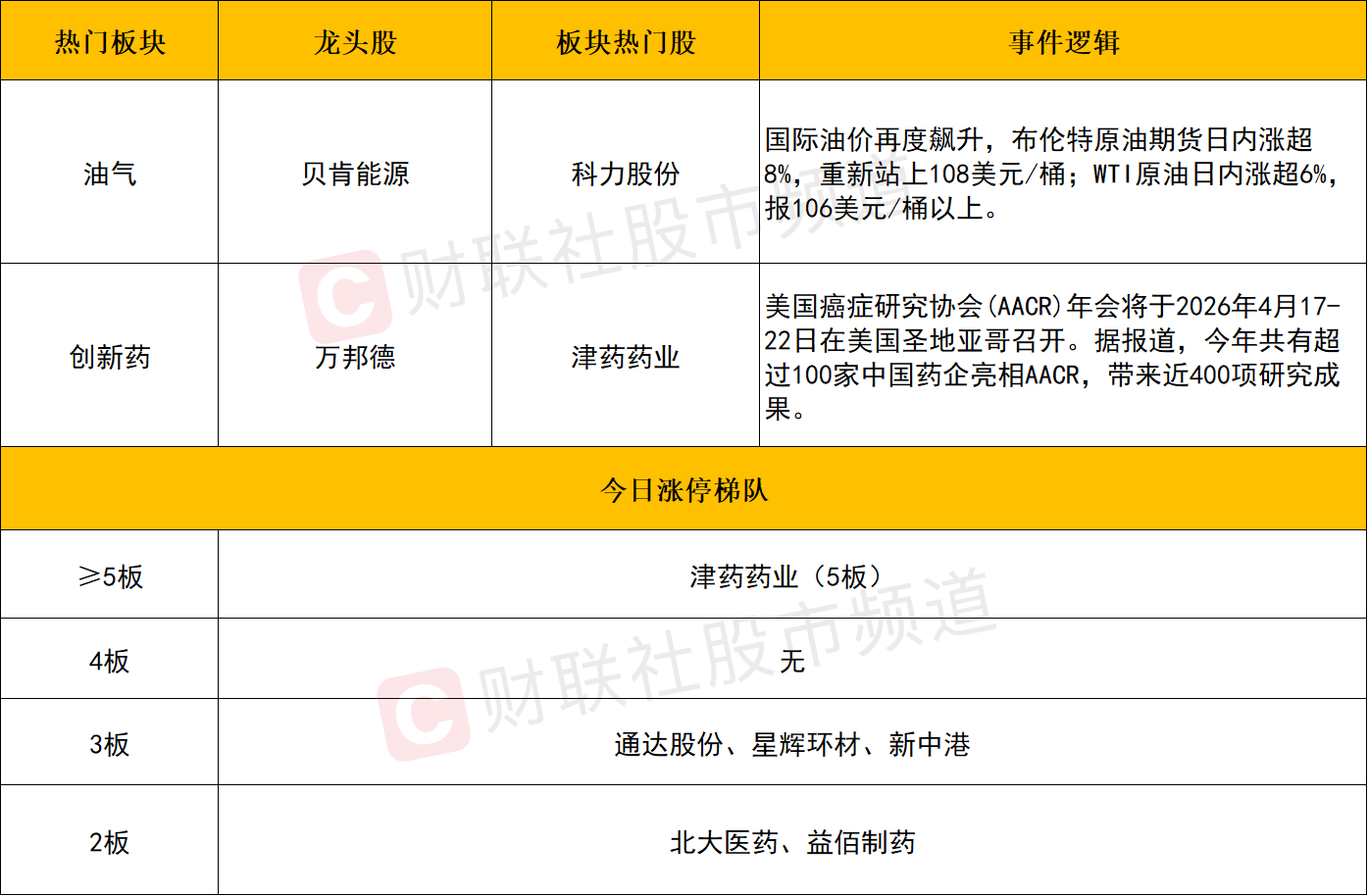油气股逆势走强,中油工程、蓝焰控股、贝肯能源涨停,科力股份、通源石油、首华燃气、中曼石油等个股涨幅居前。消息面上,国际油价再度飙升,布伦特原油期货日内涨超8%,重新站上108美元/桶;WTI原油日内涨超6%,报106美元/桶以上。