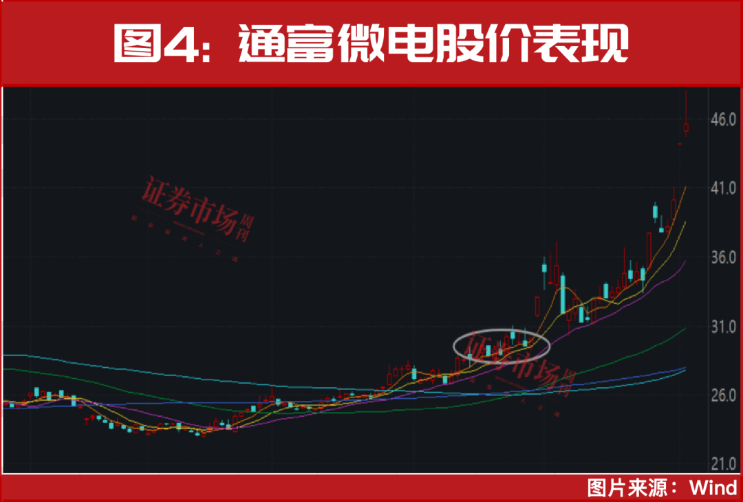 在之前8月下旬的内容里,笔者重点筛选了32只半导体产业链核心公司,从后市来看,其中绝大多数公司股价都开启了上涨,如芯片制造环节的华虹公司(见图3)、封测领域的通富微电(见图4)等。除了上述标的,32只标的中还有很多处在相对中低位,其中有不少标的在最近走出右侧放量突破。有关更多完整的32只半导体产业链核心公司名单,大家可见《章建平已大赚38个亿?别再错过这一轮牛市加速机会了!》。