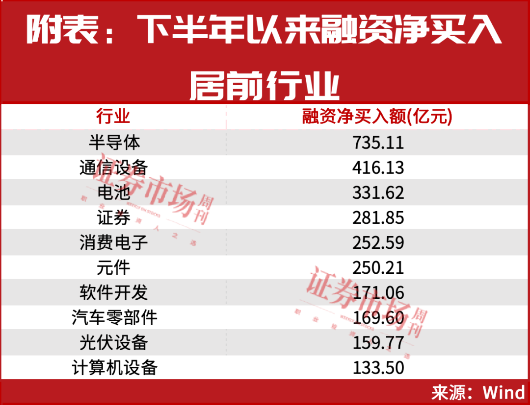 在长期向好的趋势下,半导体正成为杠杆资金加仓的主要目标。如今年下半年以来,半导体获融资净买入达735亿元,位列行业板块Top1(见附表),最近一个月,半导体获融资净买入超230亿元,同样位列Top1。