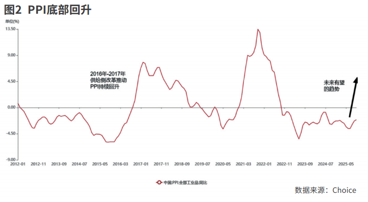 2016-2017年正是通过供给侧改革,推动PPI价格持续回升,并带动上下游企业利润的改善。PPI从2025年底的-5.9%持续回升至2017年2月的7.2%。当时市场对价格的回暖也反应非常积极,A股也走出了以核心资产为代表的慢牛。