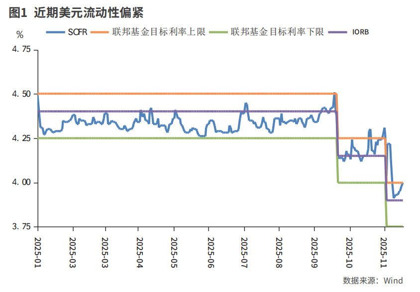 本轮美元流动性已渡过最紧张状态,预计即将重回平稳。一是11月12日美国政府重启,前期积压的财政支出如联邦雇员薪资补发、采购履约和转移性支付等将集中释放,TGA余额预计将从高位回落,向市场注入大量流动性。11月10日,美国参议院通过临时拨款法案后,政府重启的预期已经令市场情绪明显改善。11月12日相较10日,道指和标普500分别上涨1.9%和0.3%,10年期美债收益率下行4BPs至4.07%,美元指数小幅回落至99.5,伦敦金现上涨1.9%至4195美元/盎司。