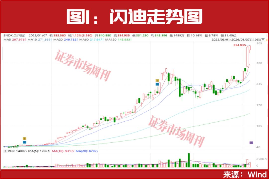 当地时间1月6日,美股存储概念股飙升,闪迪大涨27.56%(见图1);美光科技大涨10.02%,股价均刷新了历史新高。