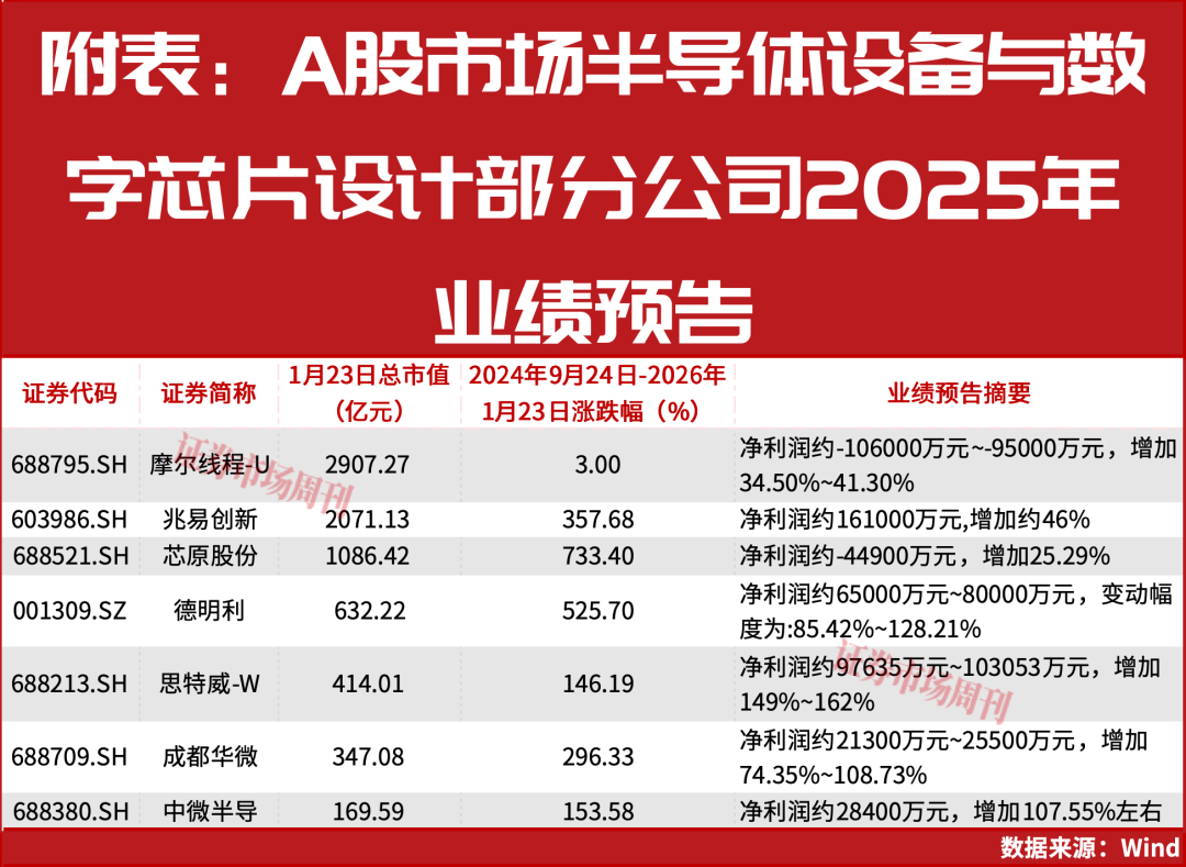 自2024年“9·24”行情发动以来至2026年1月23日,半导体设备(申万)指数(850818.SI)上涨196.06%,区间最大涨幅为215.41%;数字芯片设计(申万)指数(850814.SI)上涨234.36%,区间最大涨幅为256.24%。同时,两大细分板块的龙头股也表现出色,比如兆易创新区间涨幅达357.68%,中微公司涨幅达213.86%。